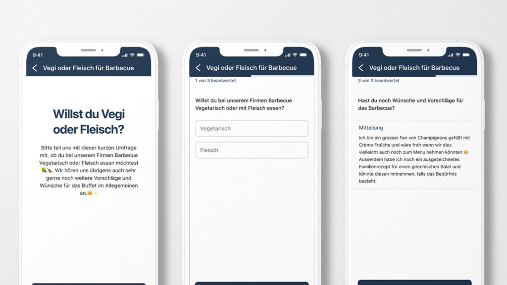 Sammle Meinungen und treffe bessere Entscheidungen: Mit der Umfrage-Funktion kannst du schnell Feedback von deinem Team einholen – ob zur nächsten Betriebsausflugsplanung, zur Einschätzung von Projekten oder anderen wichtigen Themen.