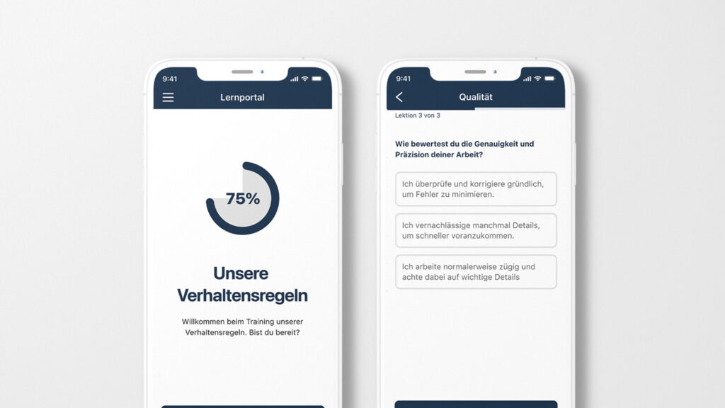Fördere Wissen und Weiterbildung: Im Lernportal können deine Mitarbeiter wichtige Dokumente, Anleitungen und Schulungsmaterialien abrufen – alles nach Abteilungen geordnet. So hat jeder Zugriff auf die Informationen, die er für seine Arbeit benötigt, und kann sich individuell weiterentwickeln.